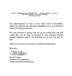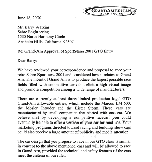 In April of 2000, Sabre conceived the idea for a road car that would compete in endurance racing against the best sports cars in the world, including the American icons Dodge Viper and Chevrolet Corvette. It would be a very low production car that would utilize a proprietary V8 motor, transaxle, composite aluminum honeycomb chassis and feature a unique retro style 'California hot rod' body design. Sabre has gone on to assemble a multi-million dollar effort to campaign the car in Grand Am's GTS ( Grand Touring Super ) class. The car, to be known as the SportStar, is entirely its own design. It includes a proprietary chassis, a motor of unique two-valve pushrod technology, a technically advanced transaxle and corporate partners to help execute the project. The decision to enter the Grand Am Series first is part of Sabre's a graduated plan to see the car eventually approved to compete in all endurance racing's various series and races, including the 24 Hours of Le Mans. Grand Am Approval After Sabre's decision to build a sports car racer based on its endurance prototype, it entered into discussions with the Grand American Road Racing Association to gain approval for the SportStar to compete in the GTO Class. After further negotiations, Grand Am approved the concept of a small manufacturer racing first to build a brand and then building road cars. In June of 2000, Grand Am sent a letter of conceptual approval of the SportStar. ![]()
